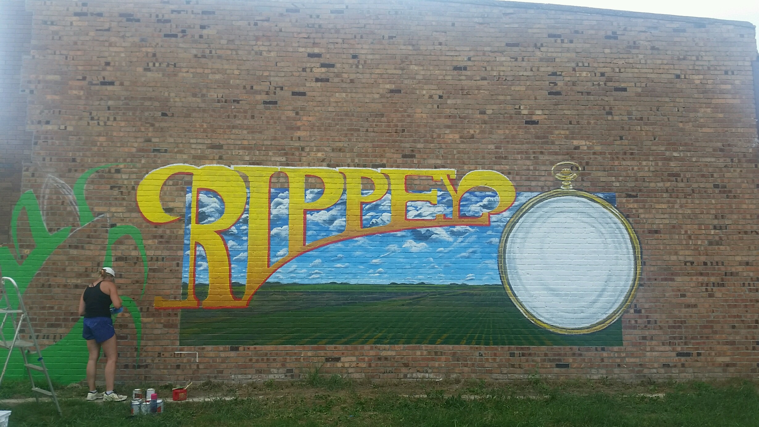 Sarah Stotts of Jefferson is pictured here as she has begun painting the Rippey sesquicentennial mural on the side of the Rolling Hills Bank building in Rippey.