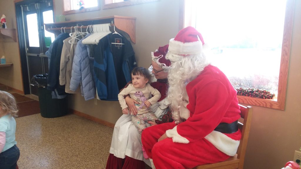 Santa and Mrs. Claus arrived with Christmas bells jingling and visited with 17 small ones and one or two adults who wanted to whisper their wishes into his ear.
