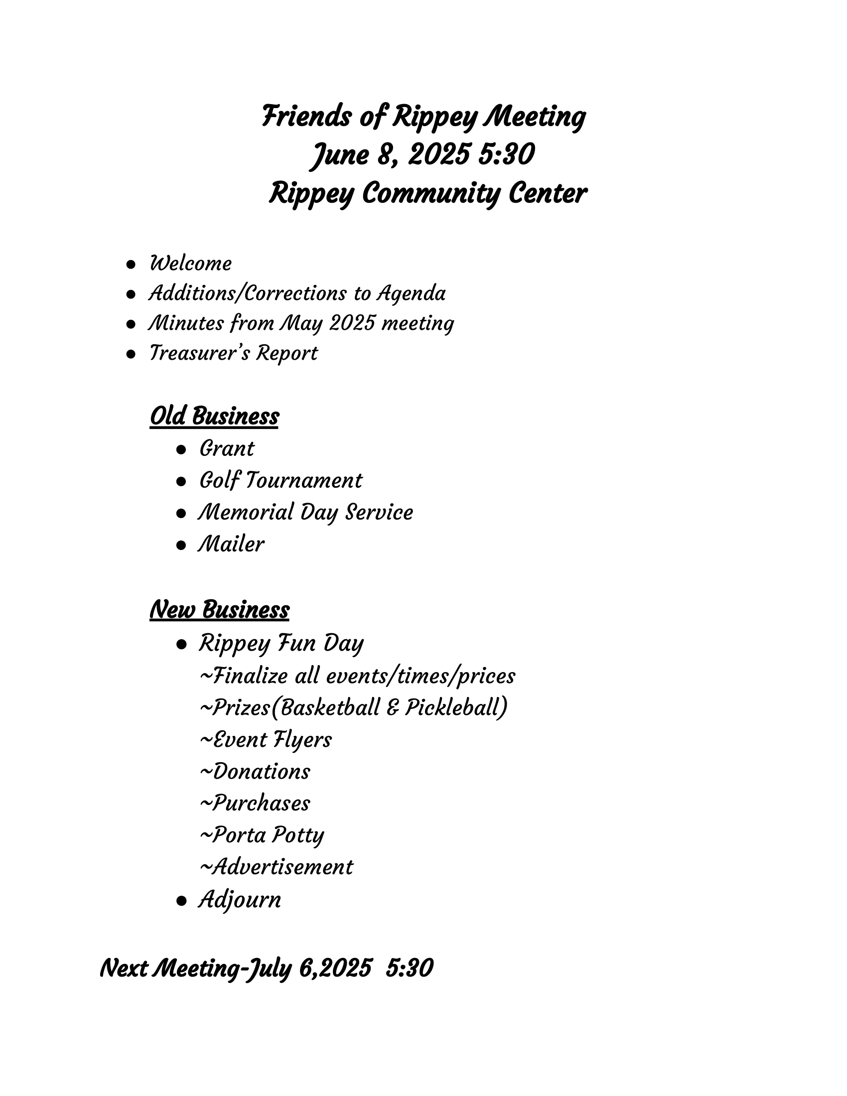 « All Events This event has passed. Friends of Rippey Meeting June 8, 2025 @ 5:30 pm – 6:30 pm Rippey Community Center 224 Main St. Rippey, IA Add to calendar Google Calendar iCalendar Outlook 365 Outlook Live