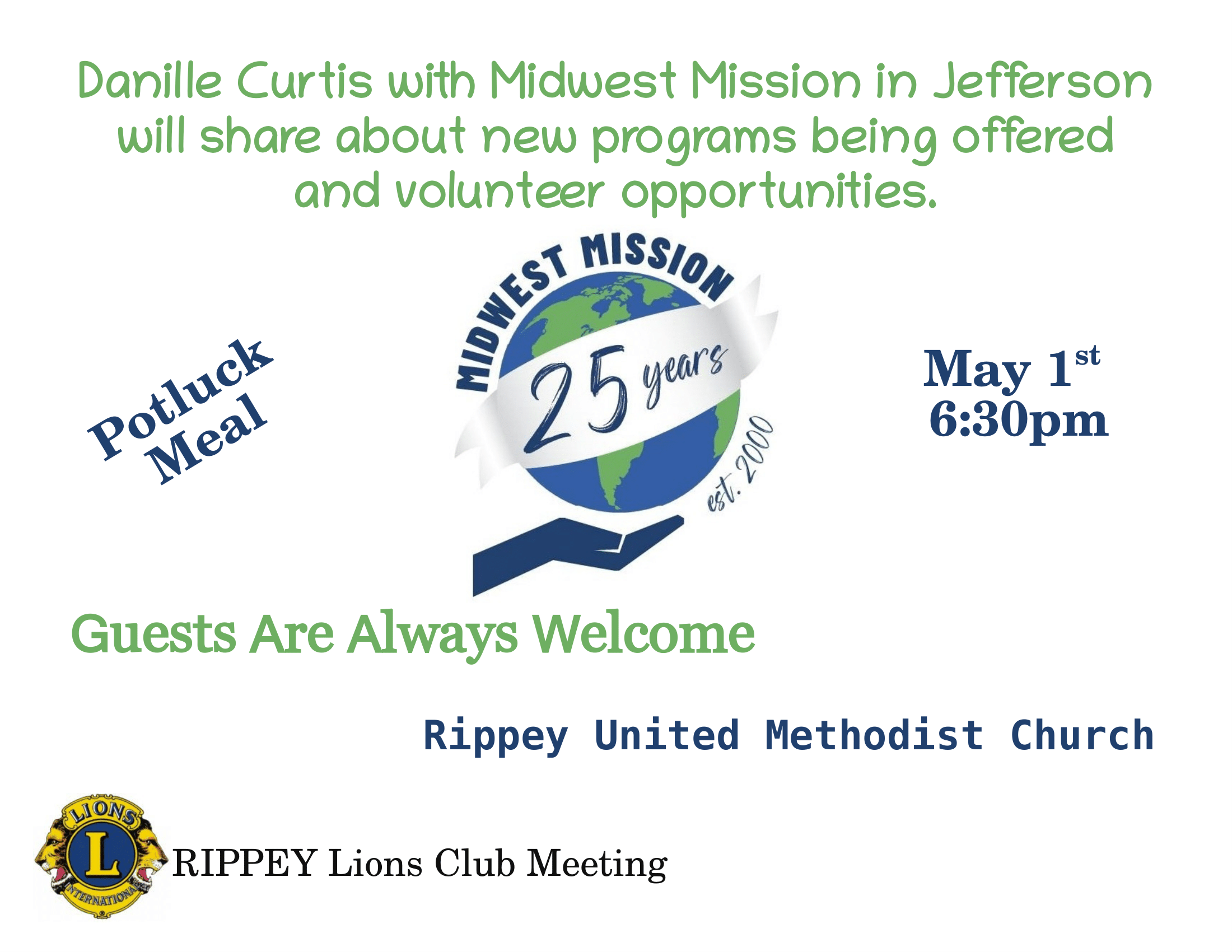 « All Events This event has passed. Lions Club Meeting May 1, 2025 @ 6:30 pm – 8:00 pm Rippey United Methodist Church 103 Main St. Rippey, IA 50235 Add to calendar Google Calendar iCalendar Outlook 365 Outlook Live
