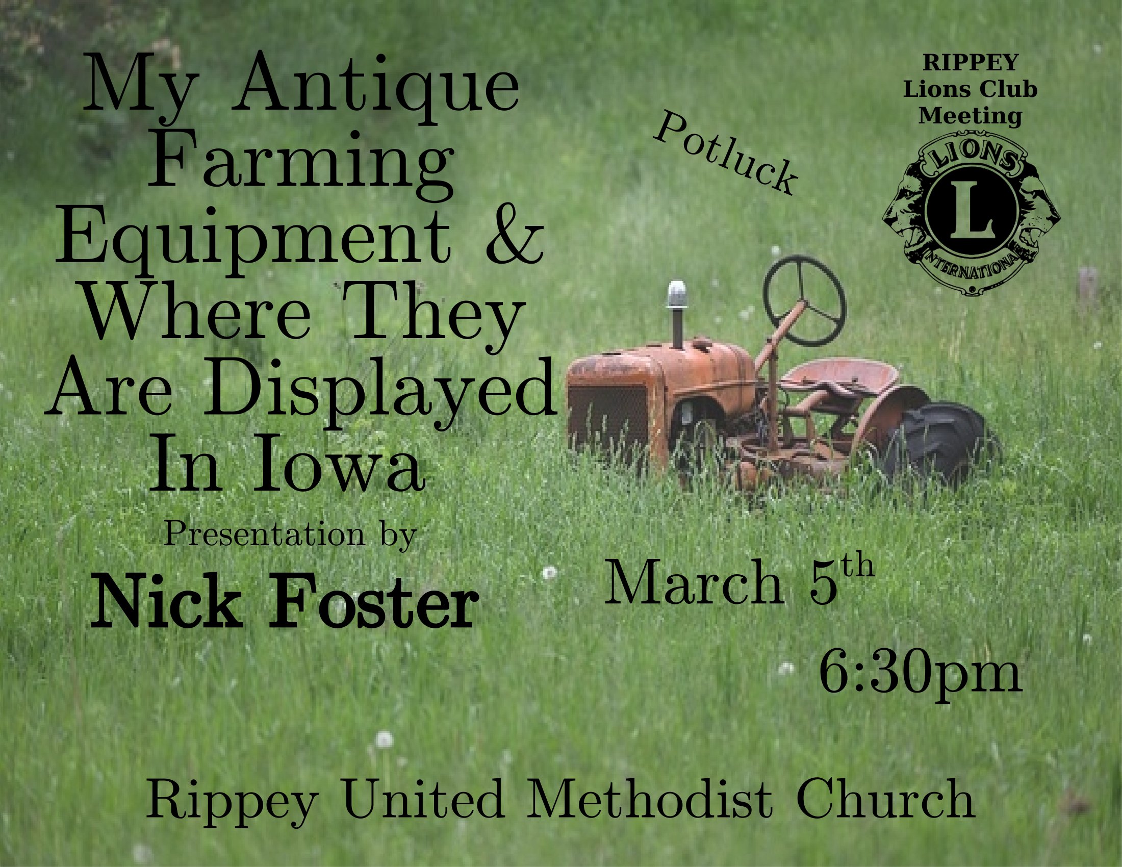 « All Events This event has passed. Lions Club Meeting March 5 @ 6:30 pm – 8:00 pm Rippey United Methodist Church 103 Main St. Rippey, IA 50235 Add to calendar Google Calendar iCalendar Outlook 365 Outlook Live