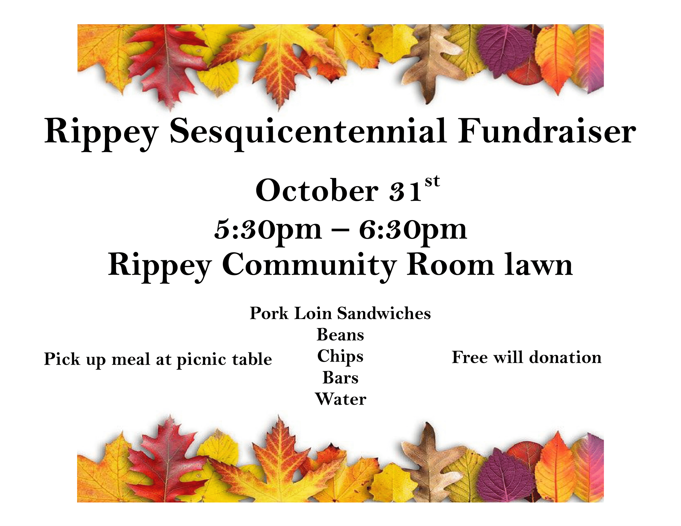 « All Events This event has passed. Sesquicentennial Fundraiser October 31, 2020 @ 5:30 pm - 6:30 pm « Library Board Meeting Friends Of Rippey Meeting » Add to calendar Google Calendar iCalendar Outlook 365 Outlook Live Details Date: October 31, 2020 Time: 5:30 pm - 6:30 pm Venue Rippey Community Center 224 Main St. Rippey, IA