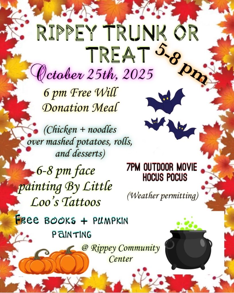 « All Events This event has passed. Trunk Or Treat October 25, 2025 @ 5:00 pm – 8:00 pm Rippey, IA Add to calendar Google Calendar iCalendar Outlook 365 Outlook Live